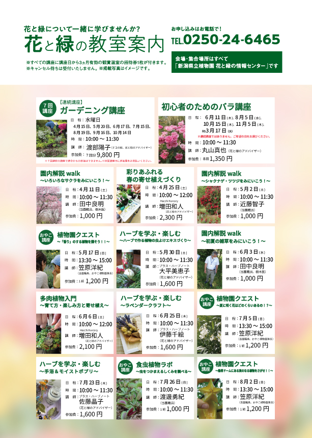 教室の詳細を当園ホームページの「展示・講座・イベント」に掲出いたしましたので、ご覧いただき、
